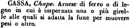 | Cassa - Chape. Arnese di ferro o di legno in cui è impernata una o più girelle alle quali si adatta la fune per muovere pesi o altro. [immagine] |