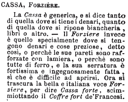 | Cassa, Forziere - La Cassa è generica, e si dice tanto di quella dove si tiene i denari, quanto di quella dove si ripone biancheria, libri o altro. - Il Forziere invece è quello specialmente dove si tengono denari e cose preziose, detto così, o perchè le sue pareti sono rafforzate con lamiera, o perchè sono tutte di ferro, e la sua serratura e fortissima e ingegnosamente fatta, sì che è difficile ad aprirsi. Ora si trascura la bella e italiana voce Forziere, per dire Cassa forte, scimmiottando il Coffre fort de' Francesi. [immagine] |