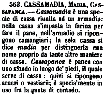 | Cassamadia, Madia, Cassapanca - Cassamadia è una specie di cassa riunita ad un armadio: nella cassa s'impasta la farina per fare il pane, nell'armadio si ripongono camangiari; la sola cassa si dice madia per distinguerla con nome proprio da tante altre maniere di casse. Cassapanca è panca con uno sfondo in luogo de' piedi, il quale serve di cassa: quivi si ripongono arnesi o vestiarii; è specialmente in uso fra la gente di contado. [immagine] |