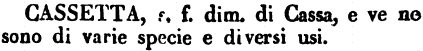 | Cassetta - s. f. dim. di Cassa, e ve ne sono di varie specie e diversi usi. [immagine] |