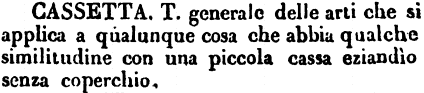 | Cassetta - T. generale delle arti che si applica a qualunque cosa che abbia qualche similitudine con una piccola cassa eziandìo senza coperchio. [immagine] |
