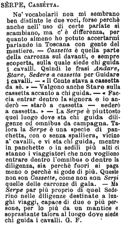 | Serpe, Cassetta - Ne' vocabolarii non mi sembrano ben distinte le due voci, forse perché anche nell'uso di certe parlate si scambiano, ma c'è differenza, per quanto almeno ho potuto accertarmi parlando in Toscana con gente del mestiere. - Cassetta è quella parte della carrozza sul davanti, e sempre scoperta, sulla quale siede chi guida i cavalli. Quindi le frasi Andare, Stare, Sedere a cassetta per Guidare i cavalli. - «Il conte stava a cassetta da sè.» - Valgono anche Stare sulla cassetta accanto a chi guida. - «Faccia entrar dentro la signora e io anderò - starò a cassetta - sederò a cassetta.» - La Serpe è piuttosto quel luogo dove sta chi guida diligenze od omnibus da campagna. Talora la Serpe è una specie di panchetta, con o senza spalliera, vicino a' cavalli, e vi sta chi guida, mentre in panchette o in sedili più alti ci stanno i viaggiatori che non vogliono entrare dentro l'omnibus o dentro la diligenza, sia perchè fuori si paga meno o perché si gode di più. Queste non son Cassette, come non son Serpi quelle delle carrozze di gala. - Ma Serpe par più proprio di quel Sederino nelle diligenze destinate a lunghi viaggi, capace di due o più persone, per lo più da un mantice e soprastante talora al luogo dove siede chi guida i cavalli. G. F. [immagine] |