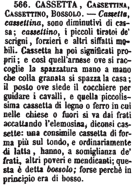 | Cassetta, Cassettina, Cassettino, Bossolo - Cassetta, cassettina, sono diminutivi di cassa; cassettino, i piccoli tiratoi de' scrigni, forzieri e altri siffatti mobili. Cassetta ha poi significati proprii; e così quell'arnese ove si raccoglie la spazzatura mano a mano che colla granata si spazza la casa; il posto ove siede il cocchiere per guidare i cavalli, e quella piccolissima cassetta di legno o ferro in cui nelle chiese o fuori si va dai frati accattando l'elemosina, diconsi cassette: una consimile cassetta di forma più sul tondo, e ordinariamente di latta, hanno, a somiglianza de' frati, altri poveri e mendicanti; questa è detta bossolo; forse perchè in principio era di bosso. [immagine] |