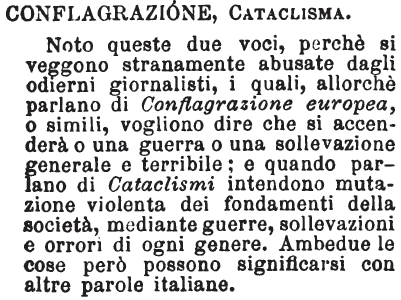 | Conflagrazione, Cataclisma - Noto queste due voci, perchè si veggono stranamente abusate dagli odierni giornalisti, i quali, allorchè parlano di Conflagrazione europea, o simili, vogliono dire che si accenderà o una guerra o una sollevazione generale e terribile; e quando parlano di Cataclismi intendono mutazione violenta dei fondamenti della società, mediante guerre, sollevazioni e orrori di ogni genere. Ambedue le cose però possono significarsi con altre parole italiane. [immagine] |