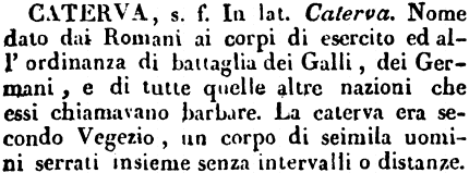 | Caterva - s. f. In lat. Caterva. Nome dato dai Romani ai corpi di esercito ed all'ordinanza di battaglia dei Galli, dei Germani, e di tutte quelle altre nazioni che essi chiamavano barbare. La caterva era secondo Vegezio, un corpo di seimila uomini serrati insieme senza intervalli o distanze. [immagine] |