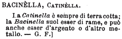 | Bacinella, Catinella - La Catinella è sempre di terracotta; la Bacinella suol essere di rame, e può anche esser d'argento o d'altro metallo. - G.F.] [immagine] |