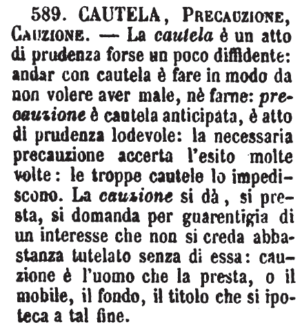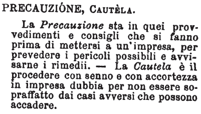 | Precauzione, Cautela - La Precauzione sta in quei provvedimenti e consigli che si fanno prima di mettersi a un'impresa, per prevedere i pericoli possibili e avvisarne i rimedii. - La Cautela è il procedere con senno e con accortezza in impresa dubbia per non essere sopraffatto dai casi avversi che possono accadere. [immagine] |