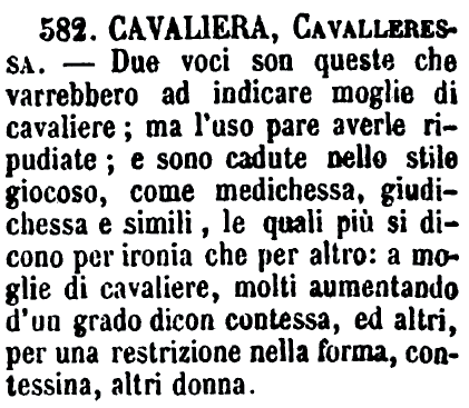 | Cavaliera, Cavalleresca - Due voci son queste che varrebbero ad indicare moglie di cavaliere; ma l'uso pare averle ripudiate; e sono cadute nello stile giocoso, come medichessa, giudichessa e simili, le quali più si dicono per ironia che per altro: a moglie di cavaliere, molti aumentando d'un grado dicon contessa, ed altri, per una restrizione nella forma, contessina, altri donna. [immagine] |