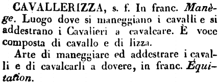 | Cavallerizza - S. f. Da CAVALLO. Luogo destinato all'insegnamento e all'esercizio del cavalcare. (Fanf.) Stor. Ajolf. (C) Andava ogni mattina alla cavallerizza, e maneggiava molti cavalli. [Val.] Cocch. Op. 1. 447. Quanto bisogna per imparare il buon francese, il ballo, la cavallerizza.