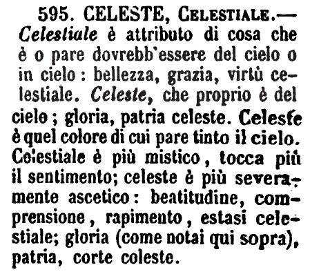 | Celeste, Celestiale - Celestiale è attributo di cosa che è o pare dovrebb'essere del cielo o in cielo: bellezza, grazia, virtù celestiale. Celeste, che proprio è del cielo; gloria, patria celeste. Celeste è quel colore di cui pare tinto il cielo. Celestiale è più mistico, tocca più il sentimento; celeste è più severamente ascetico: beatitudine, comprensione, rapimento, estasi celestiale; gloria (come notai qui sopra), patria, corte celeste. [immagine] |
