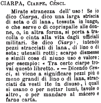 | Ciarpa, Ciarpe, Cenci - Mirata stranezza dell'uso! Se io dico Ciarpa, dico una larga striscia di seta o di lana, tessuta in lungo, e che serve o di coprispalle alle donne, o, in altra forma, si porta a tracolla o cinta alla vita dagli ufficiali militari. Se dico Ciarpe, intendo pezzi stracciati di lana, di lino o di seta; utensili rotti; scarpe dismesse e simili cose di niuno uso e valore; per esempio: «Tra certe ciarpe trovai questo libretto.» - Dicendo Cenci, si viene a significare pezzi più o meno grandi di lino o di lana, stracciati da vesti ite in disuso, i quali si usano o per nettar lumi, tavole o altro, o per mandare al mácero e farne carta. [immagine] |