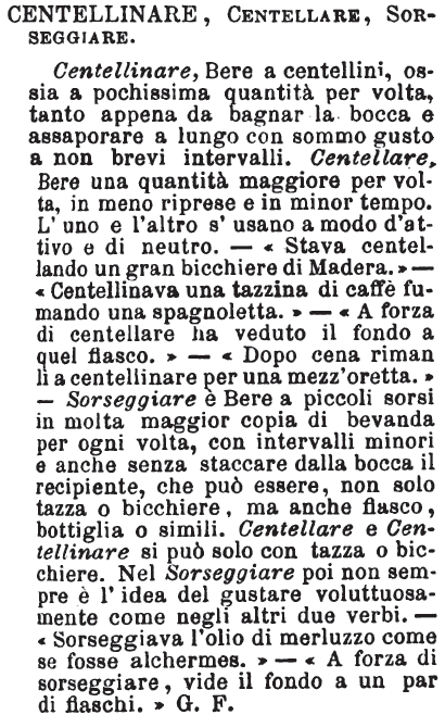 | Centellinare, Centellare, Sorseggiare - Centellinare, Bere a centellini, ossia a pochissima quantità per volta, tanto appena da bagnar la bocca e assaporare a lungo con sommo gusto a non brevi intervalli. Centellare, Bere una quantità maggiore per volta, in meno riprese e in minor tempo. L'uno e l'altro s'usano a modo d'attivo e di neutro. - «Stava centellando un gran bicchiere di Madera.» - «Centellinava una tazzina di caffè fumando una spagnoletta.» - «A forza di centellare ha veduto il fondo a quel fiasco.» - «Dopo cena riman lì a centellinare per una mezz'oretta.» - Sorseggiare è Bere a piccoli sorsi in molta maggior copia di bevanda per ogni volta, con intervalli minori e anche senza staccare dalla bocca il recipiente, che può essere, non solo tazza o bicchiere, ma anche fiasco, bottiglia o simili. Centellare e Centellinare si può solo con tazza o bicchiere. Nel Sorseggiare poi non sempre è l'idea del gustare voluttuosamente come negli altri due verbi. - «Sorseggiava l'olio di merluzzo come se fosse alchermes.» - «A forza di sorseggiare, vide il fondo a un par di fiaschi.» G. F. [immagine] |