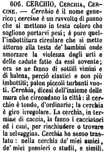 | Cerchio, Cerchia, Cercine - Cerchio è il nome generico; cercine è un ravvolto di panno che si mettono in testa coloro che sogliono portarvi pesi; è pure quell'imbottitura circolare che si mette attorno alla testa de' bambini onde smorzare la violenza degli urti e delle cadute fatte da essi sovente; ora se ne fanno di sottili vimini e di balena, perciò elastici e non più imbottiti; paion piccoli turbanti vuoti. Cerchia, dicesi dell'insieme delle mura che circondano la città: il cerchio è tondo, d'ordinario; la cerchia è giro irregolare. La cerchia, in termine di caccia, la fanno i cacciatori ed i cani, per rinchiudere o trovare la selvaggina. Cerchia ha senso traslato: nella cerchia de' miei amici, de' miei pensieri o studii, e simili. [immagine] |