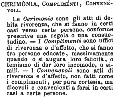 | Cerimonia, Complimenti, Convenevoli - Le Cerimonie sono gli atti di debita riverenza, che si fanno in certi casi verso certe persone, conforme prescrive una regola o una consuetudine. - I Complimenti sono uffici di riverenza e d'affetto, che si fanno tra persone educate, massimamente quando o si augura loro felicità, o temiamo di dar loro incomodo, o simili. - I Convenevoli sono atti di riverenza e d'affetto, non fatti come i complimenti, per pura cortesia, ma dicevoli e convenienti a farsi in certi casi a certe persone. [immagine] |