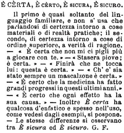 | È certa, È certo, È sicura, È sicuro - Il primo è quasi soltanto del linguaggio familiare, e non s'usa che parlandosi di certezza intorno a cose materiali o di realtà pratiche; il secondo, di certezza intorno a cose di ordine superiore, a verità di ragione. - «E' certa che non mi ci pigli più a giocare con te.» - «Stasera piove; è certa.» - «Finirà che ne tocca lui: questa è certa.» - «Ch'è sia stato sempre un mascalzone è certa.» - «E' certo che la medicina ha fatto grandi progressi in questi ultimi anni.» - «E' certo che ogni effetto ha la sua causa.» - Inoltre E' certa ha qualcosa d'enfatico e spesso nell'uso, come vedesi dagli esempii, si pospone. - Le stesse differenze si osservano tra E' sicura ed E' sicuro. G.F. [immagine] |