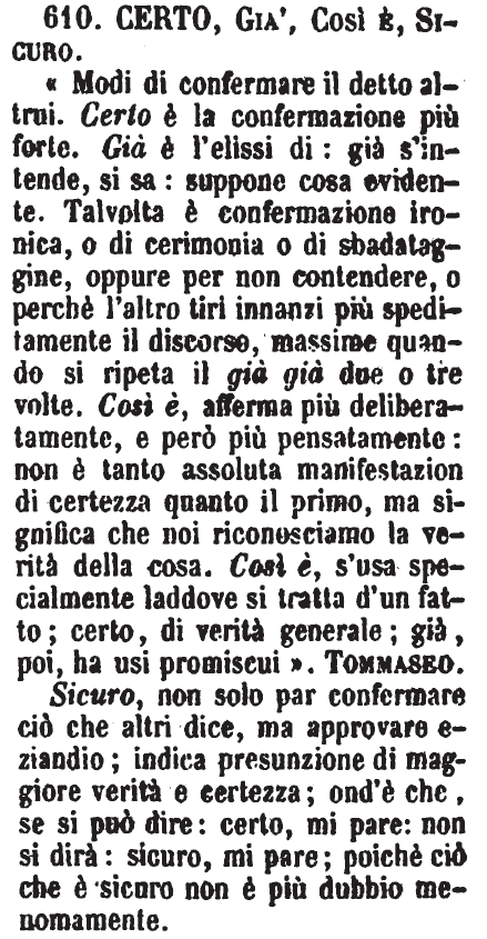 Certo, Già, Così è, Sicuro - «Modi di confermare il detto altrui. Certo è la confermazione più forte. Già è l'elissi di: già s'intende, si sa: suppone cosa evidente. Talvolta è confermazione ironica, o di cerimonia o di sbadataggine, oppure per non contendere, o perchè l'altro tiri innanzi più speditamente il discorso, massime quando si ripeta il già già due o tre volte. Così è, afferma più deliberatamente, e però più pensatamente: non è tanto assoluta manifestazion di certezza quanto il primo, ma significa che noi riconosciamo la verità della cosa. Così è, s'usa specialmente laddove si tratta d'un fatto; certo, di verità generale; già, poi, ha usi promiscui». Tommaseo.