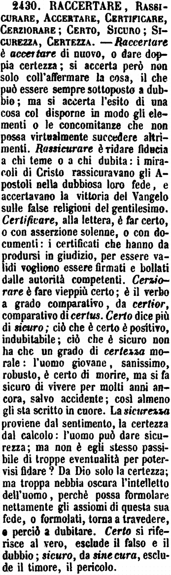 | Raccertare, Rassicurare, Accertare, Certificare, Cerziorare; Certo, Sicuro; Sicurezza, Certezza - Raccertare è accertare di nuovo, o dare doppia certezza; si accerta però non solo coll'affermare la cosa, il che può essere sempre sottoposto a dubbio; ma si accerta l'esito di una cosa col disporne in modo gli elementi o le concomitanze che non possa virtualmente succedere altrimenti. Rassicurare è ridare fiducia a chi teme o a chi dubita: i miracoli di Cristo rassicuravano gli Apostoli nella dubbiosa loro fede, e accertavano la vittoria del Vangelo sulle false religioni del gentilesimo. Certificare, alla lettera, è far certo, o con asserzione solenne, o con documenti: i certificati che hanno da prodursi in giudizio, per essere validi vogliono essere firmati e bollati dalle autorità competenti. Cerziorare è fare vieppiù certo; è il verbo a grado comparativo, da certior, comparativo di certus. Certo dice più di sicuro; ciò che è certo è positivo, indubitabile; ciò che è sicuro non ha che un grado di certezza morale: l'uomo giovane, sanissimo, robusto, è certo di morire, ma si fa sicuro di vivere per molti anni ancora, salvo accidente; così almeno gli sta scritto in cuore. La sicurezza proviene dal sentimento, la certezza dal calcolo: l'uomo può dare sicurezza; ma non è egli stesso passibile di troppe eventualità per potervisi fidare? Da Dio solo la certezza; ma troppa nebbia oscura l'intelletto dell'uomo, perchè possa formolare nettamente gli assiomi di questa sua fede, o formolati, torna a travedere, e perciò a dubitare. Certo si riferisce al vero, esclude il falso e il dubbio; sicuro, da sine cura, esclude il timore, il pericolo. [immagine] |