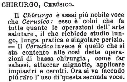 | Chirurgo, Cerusico - Il Chirurgo è assai più nobile voce che Cerusico: esso è colui che fa tutte quante le operazioni dell'arte salutare, il che richiede studio lungo, lunga pratica e singolare perizia. - Il Cerusico invece è quello che si sta contento alle così dette operazioni di bassa chirurgia, come far salassi, attaccar mignatte, applicare impiastri e cerotti. Ora si va facendo più raro l'uso di questa seconda voce. [immagine] |