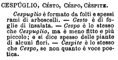 | Cespuglio, Cesto, Cespo, Cespite - Cespuglio è formato da folti e spessi rami di arboscelli. - Cesto è di foglie di insalata. - Cespo è lo stesso che Cespuglio, ma è meno fitto e più piccolo; e si dice spesso delle piante di alcuni fiori. - Cespite è lo stesso che Cespo, se non quanto è voce poetica. [immagine] |