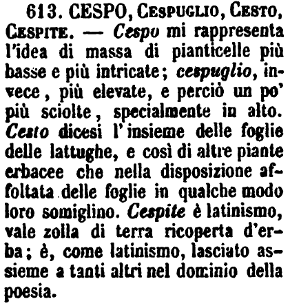 | Cespo, Cespuglio, Cesto, Cespite - Cespo mi rappresenta l'idea di massa di pianticelle più basse e più intricate; cespuglio, invece, più elevate, e perciò un po' più sciolte, specialmente in alto. Cesto dicesi l'insieme delle foglie delle lattughe, e così di altre piante erbacee che nella disposizione affoltata delle foglie in qualche modo loro somiglino. Cespite è latinismo, vale zolla di terra ricoperta d'erba; è, come latinismo, lasciato assieme a tanti altri nel dominio della poesia. [immagine] |