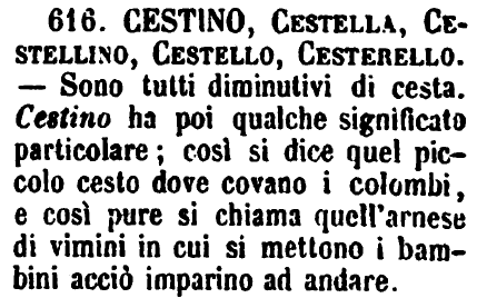 | Cestino, Cestella, Cestellino, Cestello, Cesterello - Sono tutti diminutivi di cesta. Cestino ha poi qualche significato particolare; così si dice quel piccolo cesto dove covano i colombi, e così pure si chiama quell'arnese di vimini in cui si mettono i bambini acciò imparino ad andare. [immagine] |