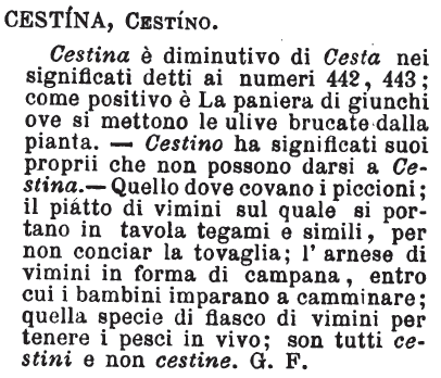 | Usando "cestina" (*) si possono ottenere i seguenti risultati: * anione = cestone; * anioni = cestoni; * annata = cestinata; * annate = cestinate. |