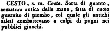 | Cesto - s. m. Ceste. Sorta di guanto, armatura antica della mano, fatta di cuoio guarnito di piombo, col quale gli antichi atleti combattevano a colpi di pugni nei pubblici giuochi. [immagine] |