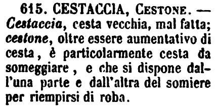 | Cestaccia, Cestone - Cestaccia, cesta vecchia, mal fatta; cestone, oltre essere aumentativo di cesta, è particolarmente cesta da someggiare, e che si dispone dall'una parte e dall'altra del somiere per riempirsi di roba. [immagine] |