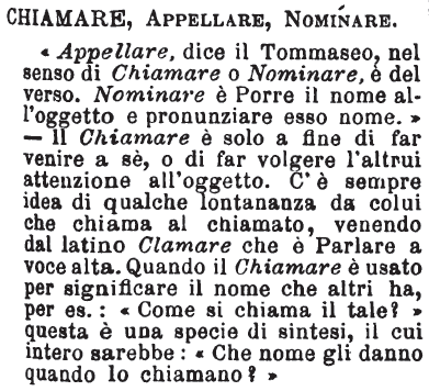 | Chiamare, Appellare, Nominare - «Appellare, dice il Tommaseo, nel senso di Chiamare o Nominare, è del verso. Nominare è Porre il nome all'oggetto e pronunziare esso nome.» - Il Chiamare è solo a fine di far venire a sè, o di far volgere l'altrui attenzione all'oggetto. C'è sempre idea di qualche lontananza da colui che chiama al chiamato, venendo dal latino Clamare che è Parlare a voce alta. Quando il Chiamare è usato per significare il nome che altri ha, per es.: «Come si chiama il tale?» questa è una specie di sintesi, il cui intero sarebbe: « Che nome gli danno quando lo chiamano?» [immagine] |