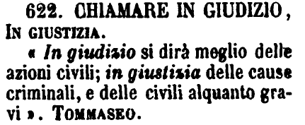 | Chiamare a giudizio, In giustizia - «In giudizio si dirà meglio delle azioni civili; in giustizia delle cause criminali, e delle civili alquanto gravi». Tommaseo. [immagine] |