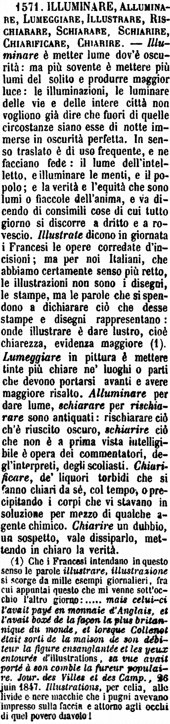 | Illuminare, Alluminare, Lumeggiare, Illustrare, Rischiarare, Schiarare, Schiarire, Chiarificare, Chiarire - Illuminare è metter lume dov'è oscurità: ma più sovente è mettere più lumi del solito e produrre maggior luce: le illuminazioni, le luminare delle vie e delle intere città non vogliono già dire che fuori di quelle circostanze siano esse di notte immerse in oscurità perfetta. In senso traslato è di uso frequente, e ne facciano fede: il lume dell'intelletto, e illuminare le menti, e il popolo; e la verità e l'equità che sono lumi o fiaccole dell'anima, e va dicendo di consimili cose di cui tutto giorno si discorre a dritto e a rovescio. Illustrate dicono in giornata i Francesi le opere corredate d'incisioni; ma per noi Italiani, che abbiamo certamente senso più retto, le illustrazioni non sono i disegni, le stampe, ma le parole che si spendono a dichiarare ciò che desse stampe e disegni rappresentano: onde illustrare è dare lustro, cioè chiarezza, evidenza maggiore (1).
