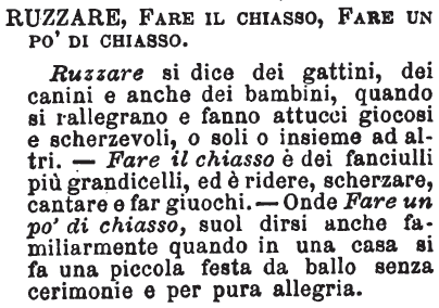| Ruzzare, Fare il chiasso, Fare un po’ di chiasso - Ruzzare si dice dei gattini, dei canini e anche dei bambini, quando si rallegrano e fanno attucci giocosi e scherzevoli, o soli o insieme ad altri. - Fare il chiasso è dei fanciulli più grandicelli, ed è ridere, scherzare, cantare e far giuochi. - Onde Fare un po' di chiasso, suol dirsi anche familiarmente quando in una casa si fa una piccola festa da ballo senza cerimonie e per pura allegria. [immagine] |