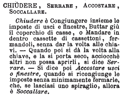| Chiudere, Serrare, Accostare, Soccallare - Chiudere è Congiungere insieme le imposte di usci e finestre, Buttar giù il coperchio di casse, o Mandare in dentro cassette di cassettoni, fermandoli, senza dar la volta alle chiavi. - Quando poi si dà la volta alla chiave, e la si porta seco, acciocchè altri non possa aprirli, si dice Serrare. - Si dice poi Accostare usci o finestre, quando si ricongiunge le imposte senza minimamente fermarle, che, se lasciasi uno spiraglio, allora è Soccallare. [immagine] |