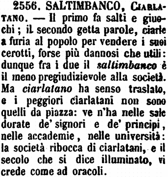 | Saltimbanco, Ciarlatano - Il primo fa salti e giuochi; il secondo getta parole, ciarle a furia al popolo per vendere i suoi cerotti, forse più dannosi che utili: dunque fra i due il saltimbanco è il meno pregiudizievole alla società. Ma ciarlatano ha senso traslato, e i peggiori ciarlatani non sono quelli da piazza: ve n'ha nelle sale dorate de' signori e de' principi, nelle accademie, nelle università: la società ribocca di ciarlatani, e il secolo che si dice illuminato, vi crede come ad oracoli. [immagine] |