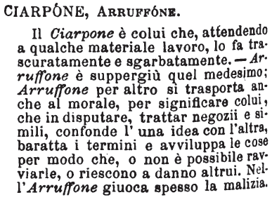 «Le altre voci da affastellare sino a strafalcione sono viventi nell'uso comune toscano, e può in certe maniere giovarsene la lingua scritta. Affastellare, ridurre in fastelli: affastellare il fieno. Per metafora, confondere, ammontare più cose insieme, operare alla rinfusa, ch'è la vera maniera di non conchiudere nulla mai. Abborracciare s'intende più spesso d'un lavoro alla volta, ma fatto precipitosamente e senza cura. Dagli abboraccioni non v'è da aspettarsi nulla di buono. E' non vedono, o non si curano di vedere quei difetti che l'ingegno retto scorge, e non può soffrire. Poi viene arrocchiare, acciarpare, acciabattare. Può talvolta l'uomo, o per sollecitudine o per bisogno, essere costretto ad abborracciare, ad arrocchiare: ma acciarpare, acciabattare dipingono incuria e precipitanza naturale: quella smania inquieta di levarsi prestamente il lavoro dalle mani. Abborracciare, arrocchiare, cadono più frequenti trattando di cose ove molta parte abbia l'intelletto, come, lettura e simili; acciarpare, acciabattare, riguardano, nell'uso odierno, azioni piuttosto materiali. Un pretucolo scagnozzo, mal conoscendo la dignità del suo ministero, abborraccia la messa, arrocchia l'uffizio. Non già che anche d'un legnaiuolo, per esempio, non si potesse dire abborraccione, arrocchione; ma viceversa, nell'esempio di sopra, non avrebbe luogo acciarpare, acciabattare. Quindi ciarpone, ciabattone, nell'uso, denotano uomo trasandato in tutto, anco nel vestito, nel vivere; laddove abborracciare, arrocchiare, sogliono esprimere, com'ho detto, azione ch'abbia un po' più dell'intellettuale. Strafalcione, chi opera a sbalzi e senza considerazione. Strafalciare, ch'è il suo verbo analogo, è dell'uso anch'esso». Meini.