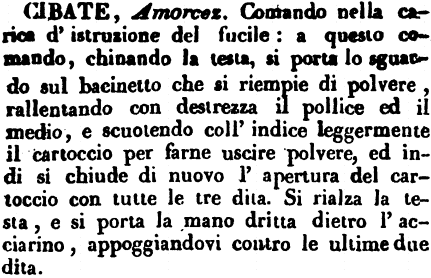 Cibate - Amorcez. Comando nella carica d'istruzione del fucile: a questo comando, chinando la testa, si porta lo sguardo sul bacinetto che si riempie di polvere, rallentando con destrezza il pollice ed il medio, e scuotendo coll'indice leggermente il cartoccio per farne uscire polvere, ed indi si chiude di nuovo l'apertura del cartoccio con tutte le tre dita. Si rialza la testa, e si porta la mano dritta dietro l'acciarino, appoggiandovi contro le ultime due dita. [immagine]