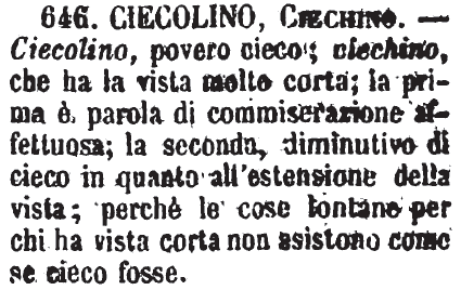| Scartando le parti in comune (in coda e il riflesso in capo), "ciechino" si può ottenere dalle seguenti coppie: cicca/accechino, cieco/occhino. |