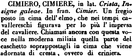 | Elmo, Cimiero - «Cimiero (cima) è il sommo dell'elmo, guarnito di divisa o di piume. G. Villani, lib. VII, cap. 9: «Manfredi, mettendosi l'elmo in testa, un'aquila d'argento che v'era su per cimiero, gli cadde in sull'arcione». Polidori.