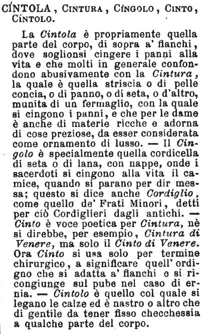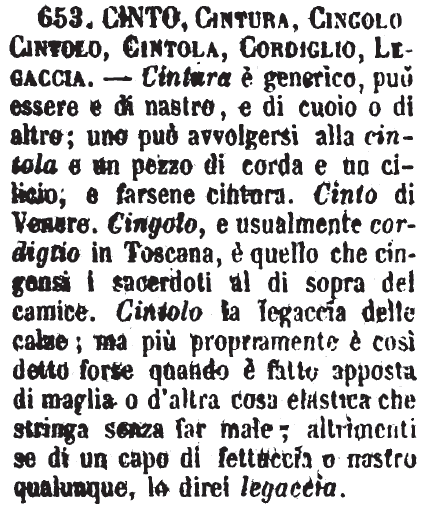 | Cinto, Cintura, Cingolo, Cintolo, Cintola, Cordiglio, Legaccia - Cintura è generico, può essere e di nastro, e di cuoio o di altro; uno puo avvolgersi alla cintola e un pezzo di corda e un cilicio, e farsene cintura. Cinto di Venere. Cingolo, e usualmente cordiglio in Toscana, è quello che cingensi i sacerdoti al di sopra del camice. Cintolo la legaccia delle calze; ma più propriamente è così detto forse quando è fatto apposta di maglia o d'altra cosa elastica che stringa senza far male; altrimenti se di un capo di fettuccia o nastro qualunque, la direi legaccia. [immagine] |