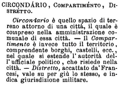 | Circondario, Compartimento, Distretto - Circondario è quello spazio di terreno attorno di una città, il quale è compreso nella amministrazione comunale di essa città. - Il Compartimento è invece tutto il territorio, comprendente borghi, castelli, ecc., nel quale si estende l'autorità dell'ufficiale politico, che risiede nella città. - Distretto, accattato da' Francesi, vale su per giù lo stesso, e indica giurisdizione militare. [immagine] |