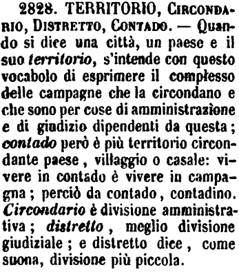 | Territorio, Circondario, Distretto, Contado - Quando si dice una città, un paese e il suo territorio, s'intende con questo vocabolo di esprimere il complesso delle campagne che la circondano e che sono per cose di amministrazione e di giudizio dipendenti da questa; contado però è più territorio circondante paese, villaggio o casale: vivere in contado è vivere in campagna; perciò da contado, contadino. Circondario è divisione amministrativa; distretto, meglio divisione giudiziale; e distretto dice, come suona, divisione più piccola. [immagine] |