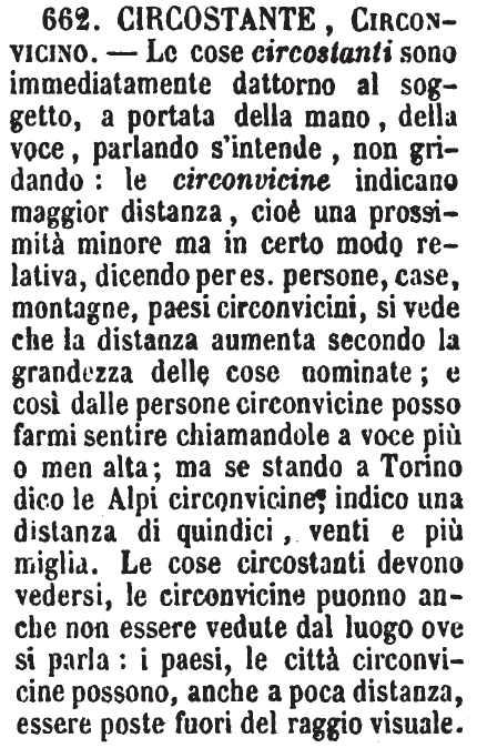 | Circostante, Circonvicino - Le cose circostanti sono immediatamente dattorno al soggetto, a portata della mano, della voce, parlando s'intende, non gridando: le circonvicine indicano maggior distanza, cioè una prossimità minore ma in certo modo relativa, dicendo per es. persone, case, montagne, paesi circonvicini, si vede che la distanza aumenta secondo la grandezza delle cose nominate; e così dalle persone circonvicine posso farmi sentire chiamandole a voce più o men alta; ma se stando a Torino dico le Alpi circonvicine; indico una distanza di quindici, venti e più miglia. Le cose circostanti devono vedersi, le circonvicine puonno anche non essere vedute dal luogo ove si parla: i paesi, le città circonvicine possono, anche a poca distanza, essere poste fuori del raggio visuale. [immagine] |