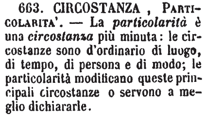 | Circostanza, Particolarità - La particolarità è una circostanza più minuta: le circostanze sono d'ordinario di luogo, di tempo, di persona e di modo; le particolarità modificano queste principali circostanze o servono a meglio dichiararle. [immagine] |