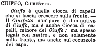 | Ciuffetto, Ciuffo, Ciocca - Il primo è diminutivo del secondo; è pure vezzeggiativo, e sotto quest'aspetto ha nel dialetto milanese un senso particolare che vale ragazzo vispo e vivace. Il ciuffo è quella ciocca di capelli che ombreggia la fronte: ciocca dicesi anche di foglie e di fiorellini quando molti di essi si spiccano, formando masso, da un solo stelo. [immagine] |