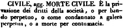 | Civile, agg. Morte Civile - È la privazione dei diritti della società, o per bando perpetuo, o come condannato a galera perpetua, o a morte per contumacia. [immagine] |