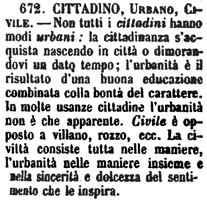| Cittadino, Urbano, Civile - Non tutti i cittadini hanno modi urbani: la cittadinanza s'acquista nascendo in città o dimorandovi un dato tempo; l'urbanità è il risultato d'una buona educazione combinata colla bontà del carattere. In molte usanze cittadine l'urbanità non è che apparente. Civile è opposto a villano, rozzo, ecc. La civiltà consiste tutta nelle maniere, l'urbanità nella maniere insieme e nella sincerità e dolcezza del sentimento che le inspira. [immagine] |