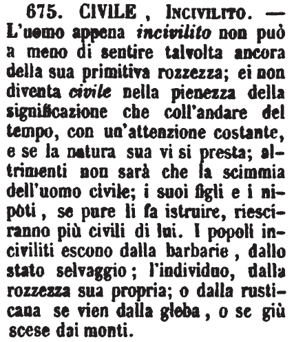 | Civile, Incivilito - L'uomo appena incivilito non può a meno di sentire talvolta ancora della sua primitiva rozzezza; ei non diventa civile nella pienezza della significazione che coll'andare del tempo, con un'attenzione costante, e se la natura sua vi si presta; altrimenti non sarà che la scimmia dell'uomo civile; i suoi figli e i nipoti, se pure li fa istruire, riesciranno più civili di lui. I popoli inciviliti escono dalla barbarie, dallo stato selvaggio; l'individuo, dalla rozzezza sua propria; o dalla rusticana se vien dalla gleba, o se giù scese dai monti. [immagine] |