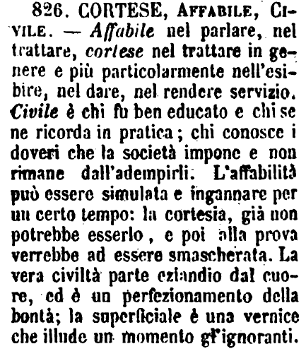 | Cortese, Affabile, Civile - Affabile nel parlare, nel trattare, cortese nel trattare in genere e più particolarmente nell'esibire, nel dare, nel rendere servizio. Civile è chi fu ben educato e chi se ne ricorda in pratica; chi conosce i doveri che la società impone e non rimane dall'adempirli. L'affabilità può essere simulata e ingannare per un certo tempo: la cortesia, già non potrebbe esserlo, e poi alla prova verrebbe ad essere smascherata. La vera civiltà parte eziandio dal cuore, ed è un perfezionamento della bontà; la superficiale è una vernice che illude un momento gl'ignoranti. [immagine] |