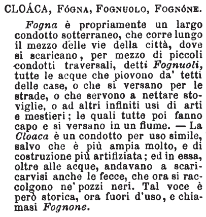 | Fogna, Cloaca, Fognone - Fogna è condotto sotterraneo per ricevere e sgorgare acque immonde. - Cloaca è condotto per uso simile, ma assai più grande e costruito con maggior artifizio: è la principal fogna della città, che per ciò a Firenze si chiama Fognone, essendo la voce Cloaca piuttosto storica che dell'uso, e adoperandosi per ricettacolo di altre immondezze. [immagine] |