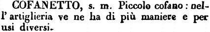 | Cofanetto - s. m. Piccolo cofano: nell'artiglieria ve ne ha di più maniere e per usi diversi. [immagine] |